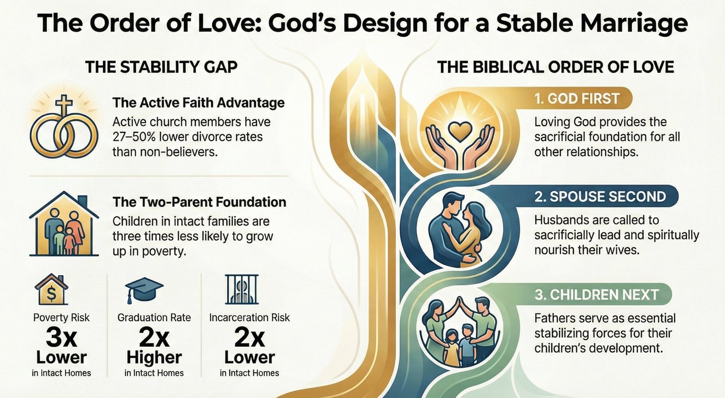 We discuss compelling statistics showing how active church involvement dramatically lowers divorce rates and why intact families remain one of the strongest stabilizing forces in society. Central to the conversation is a biblical hierarchy of love: God first, spouse second, and children third—and how reversing this order leads to unintended harm.